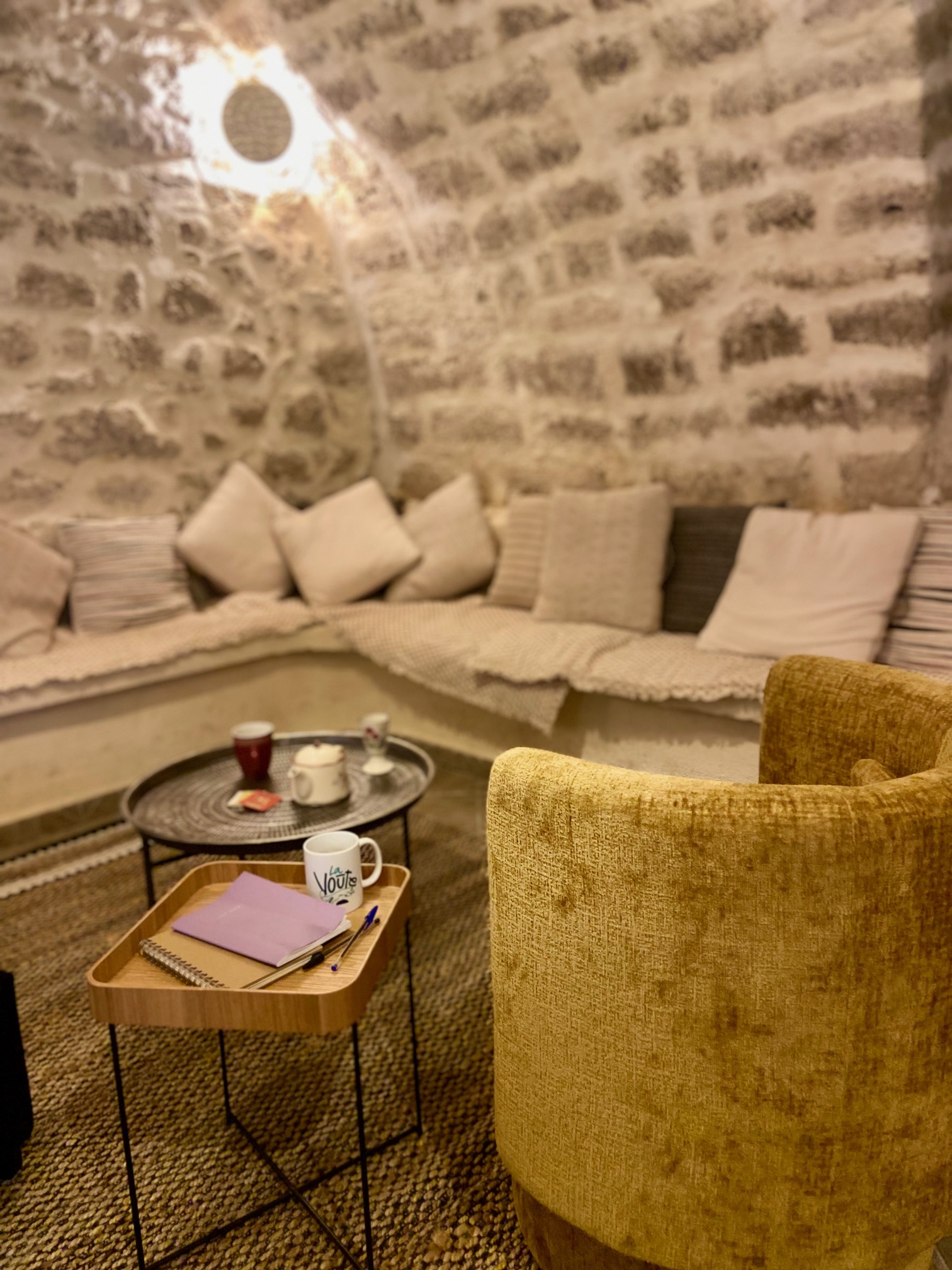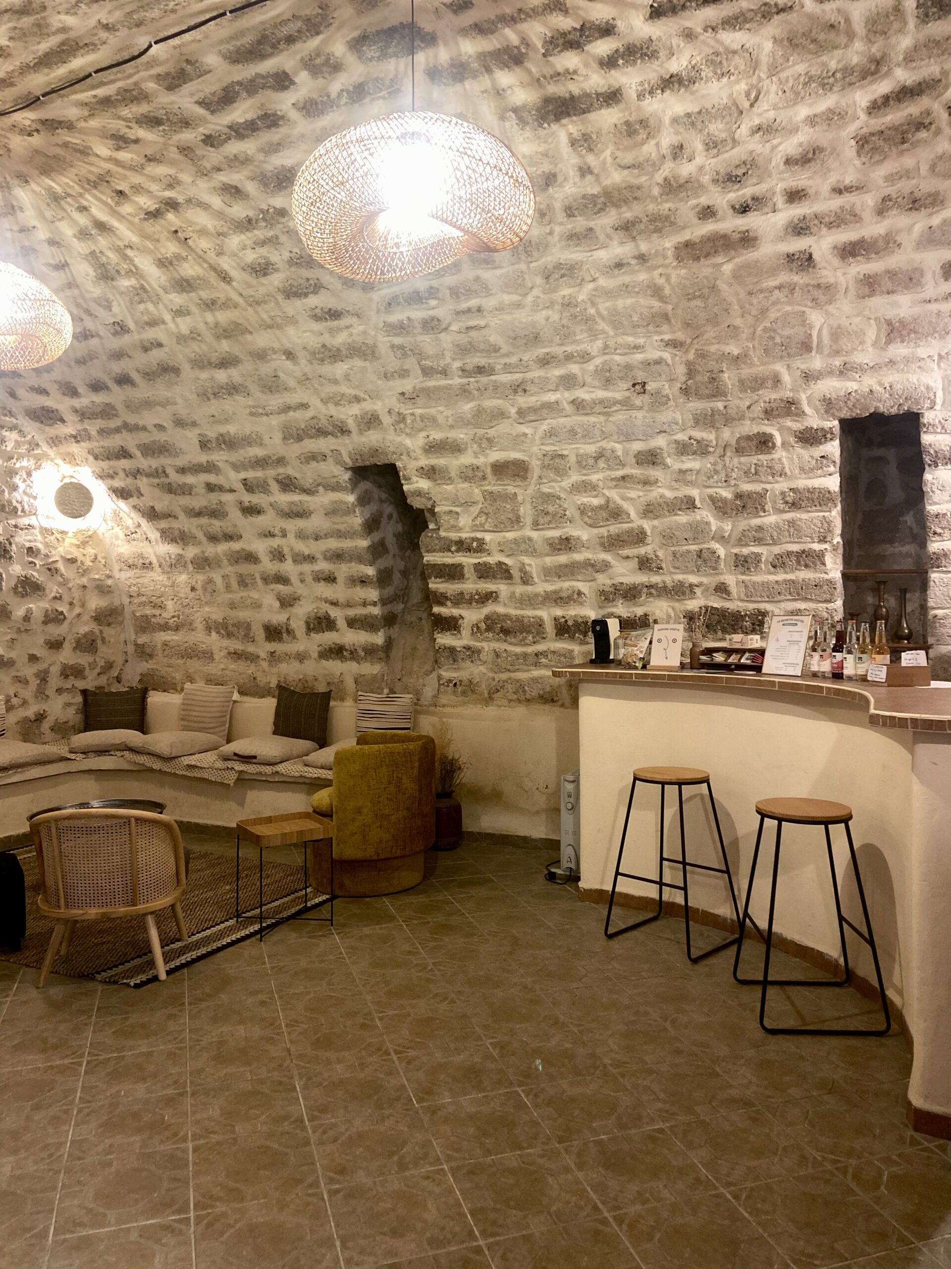 - Une arrière-salle voûtée en pierres, plus intimiste, pour se poser, rêver, se concentrer ou partager.